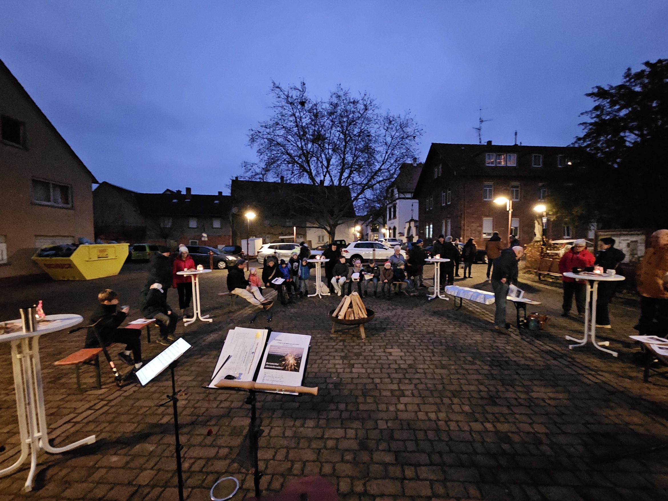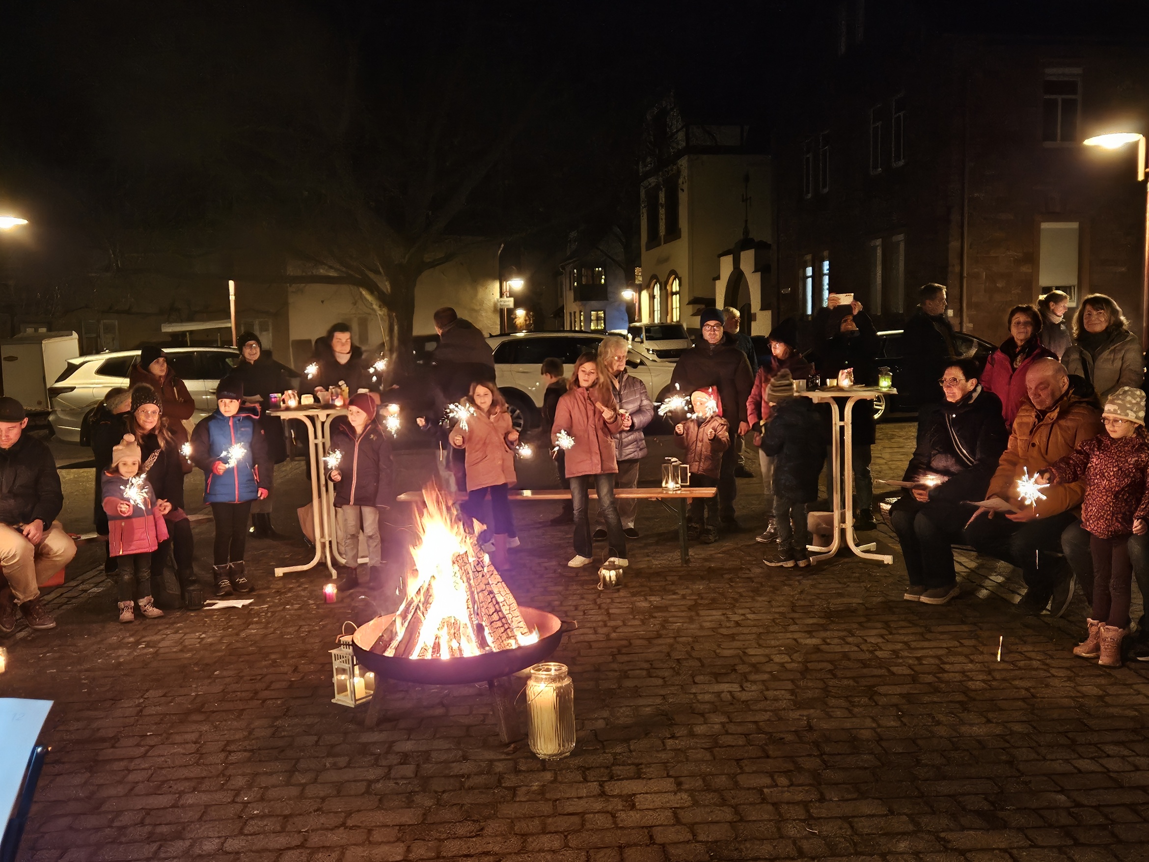 Mit der Liedstrophe „Ein Funke kaum zu sehn“ begrüßten wir am dritten Adventssonntag das Friedenslicht aus Bethlehem auf dem Kirchplatz der Kirche St. Peter und Paul in Erlenbach. Das Team der Familienkirche hatte zu dieser Feier eingeladen und etwa 70 Mitfeiernde, darunter viele Kinder waren gekommen und hatten sich um die Holzscheite in der Feuerschale versammelt. Das Friedenslicht entzündete das aufgeschichtete Holz und das Feuer zauberte eine tolle Stimmung auf den Kirchplatz. In dieser Atmosphäre lauschten die Menschen den eindringlichen Texten, die dazu aufriefen, Mut zu Friedenstaten aufzubringen und verdeutlichten, dass auch der geringste Beitrag und die kleinste Tat eine Wirkung entfalten. Darauf wiesen auch die Lieder hin, die z.B. sagten, dass schon eine kleine Laterne die Welt heller machen kann. Und auch „Ein Funke Mut“ kann uns die Kraft geben, kleine Friedenstaten zu vollbringen in der Zuversicht, dass daraus ein großes „Mutfeuer“ wird.