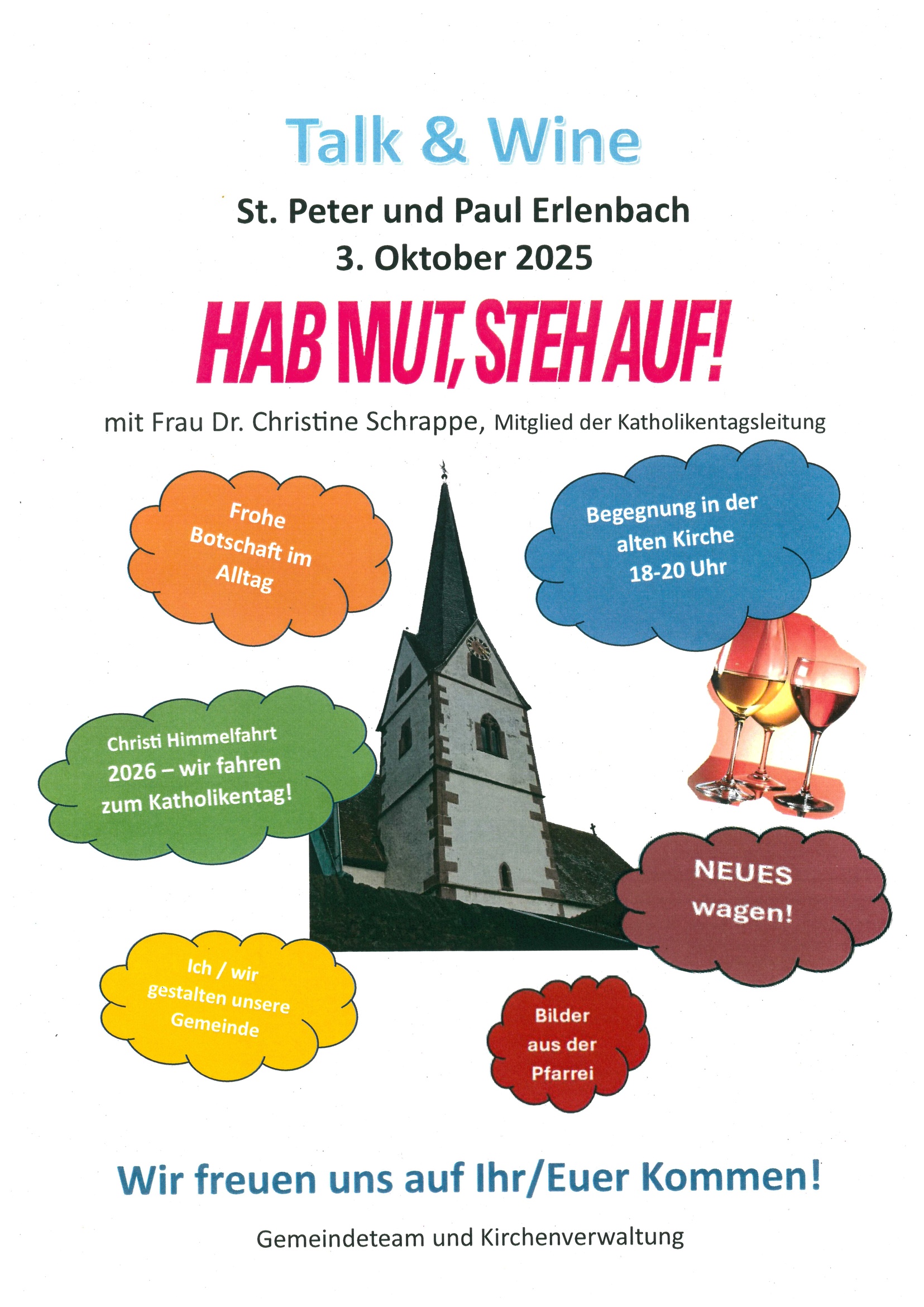 Mit Frau Dr. Christine Schrappe (Mitglied der Katholikentagsleitung im Bistum Würzburg) wird es Informationen zum Katholikentag geben und einen Austausch, wie wir uns Gemeinde vorstellen - sowie einen Fotorückblick auf die letzten Monate. Herzlich willkommen!